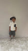 A coordinated set featuring a white cotton shirt with a stylish denim pocket detail, paired with grey denim cargo shorts. The shorts has a front fly zip and button closure, adding a touch of ease.