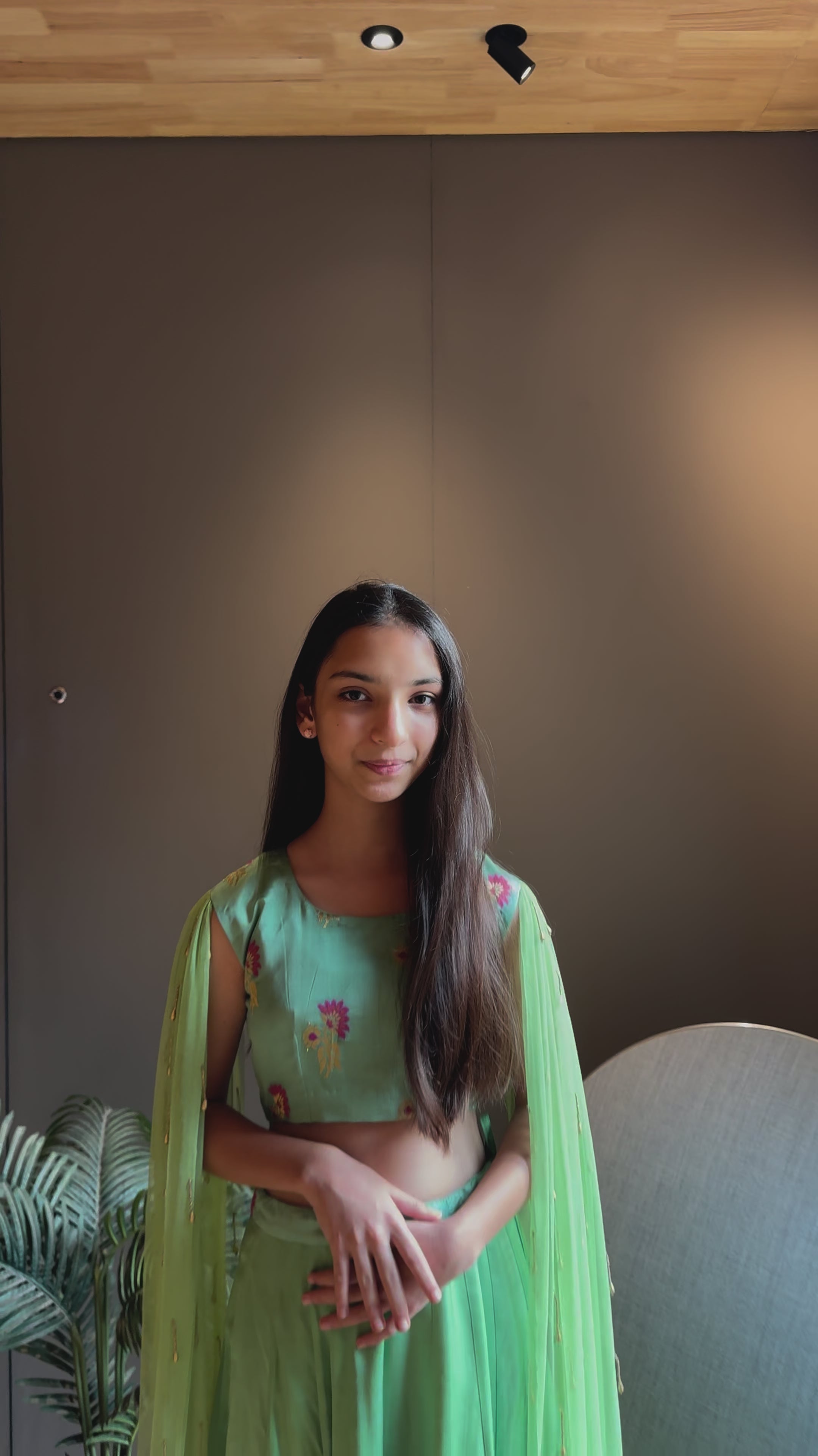 This elegant green brocade lehenga set features a long-sleeved blouse with intricate embroidery on the sleeves, adding a touch of sophistication. The blouse is short, complementing the flowing lehenga. Perfect for special occasions, this ensemble combines traditional charm with contemporary style.